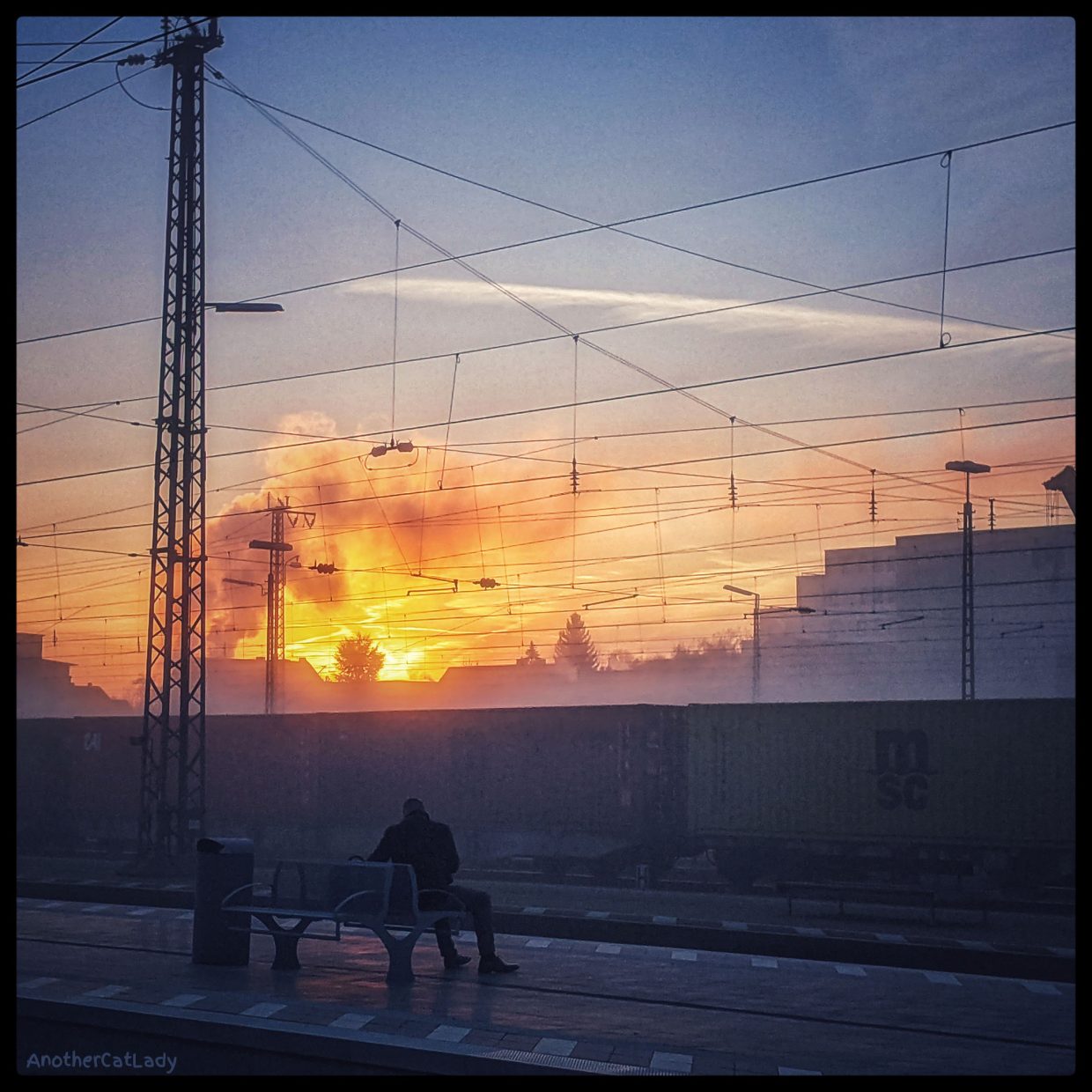 No, this is not a fire. This is just a sunrise on a cold and foggy winter morning on a train station in Germany with some industrial chimney action in the far background.